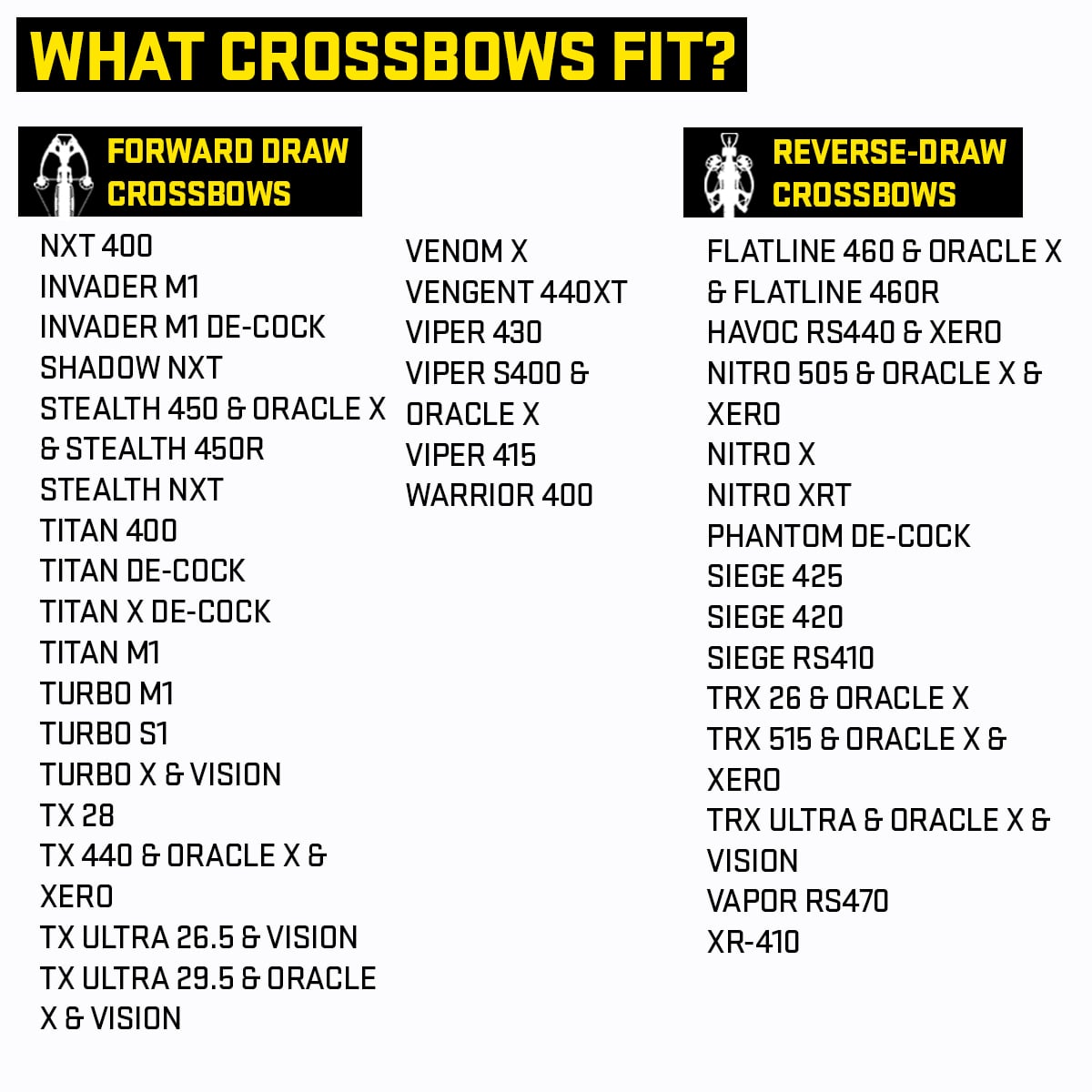 | Fitment Category: Small Reverse-Draw Crossbows | Flatline 460, Flatline 460 Oracle X, Havoc RS440, Havoc RS440 XERO, Phantom De-Cock, Siege 425, Siege RS410, TRX 26, TRX 26 Oracle X |