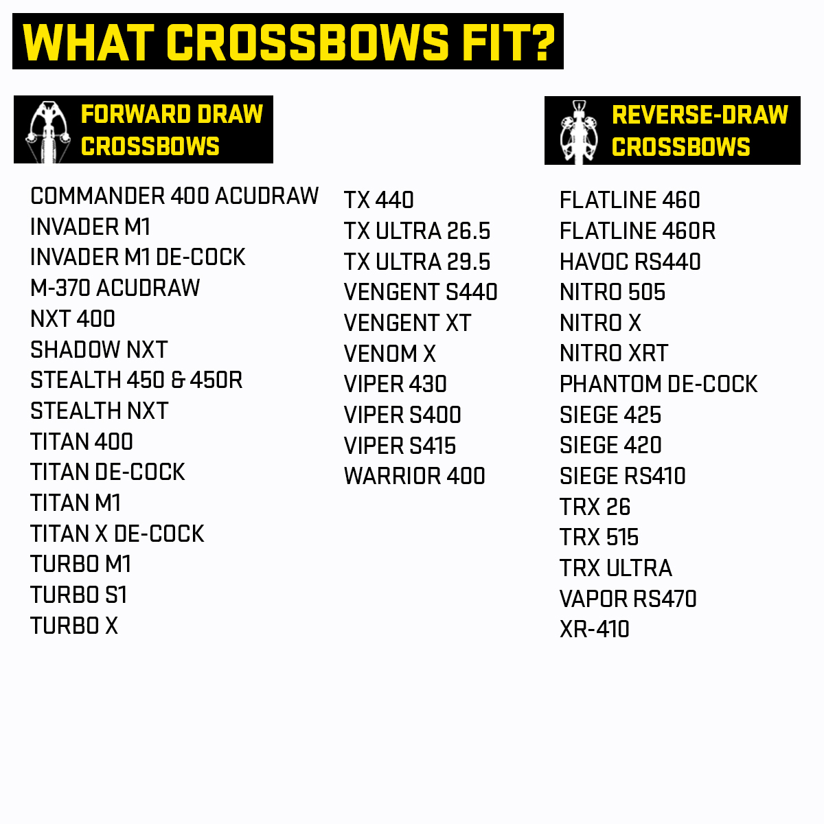 | What Forward Draw Crossbows Fit (with standard scope, Garmin® XERO® X1i, Burris® Oracle X™, or Vision™): | Commander 400 ACUdraw, Invader M1, Invader M1 De-Cock, M-370 ACUdraw, NXT 400, Shadow NXT, Stealth 450 & 450R, Stealth NXT ACUdraw & ACUdraw PRO, Titan 400, Titan De-Cock ACUdraw & ACUdraw 50, Titan M1, Titan X De-Cock, Turbo M1, Turbo S1, Turbo X, TX 440, TX Ultra 26.5 & 29.5, Vengent S440 & Vengent XT, Venom X, Viper 430, Viper S400 & S415, Warrior 400 |